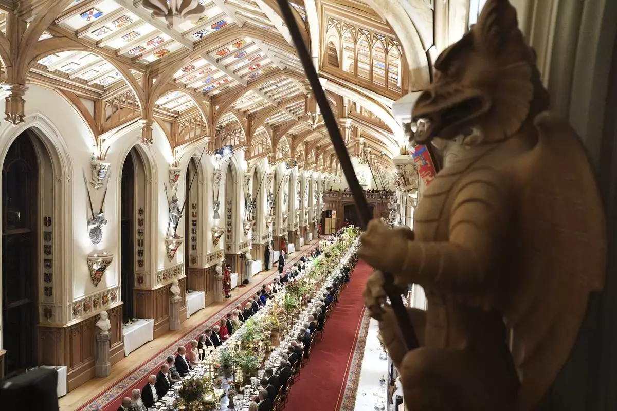 Guests attend a State Banquet during a State visit of President Donald Trump at Windsor Castle in Windsor, England, Wednesday, Sept. 17, 2025. (AP Photo/Evan Vucci, Pool)