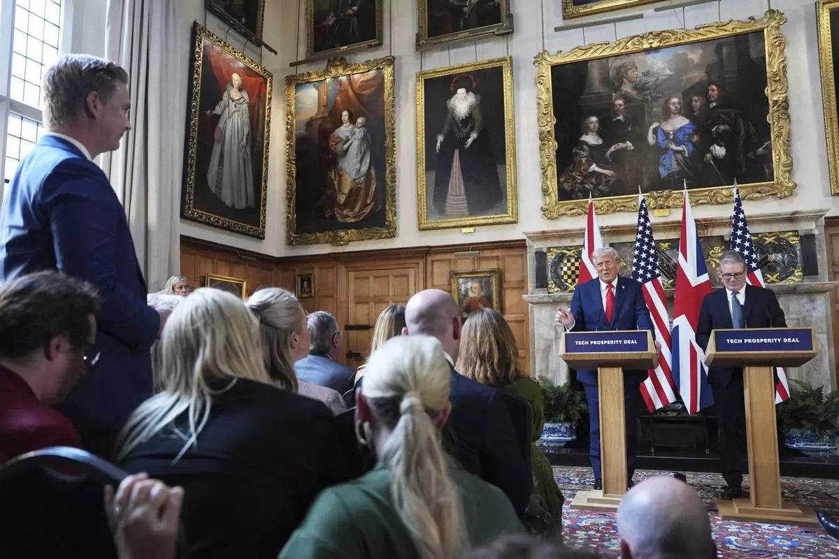 President Donald Trump gestures next to Britain's Prime Minister Keir Starmer during a joint press conference at Chequers near Aylesbury, England, Thursday, Sept. 18, 2025. (AP Photo/Evan Vucci)