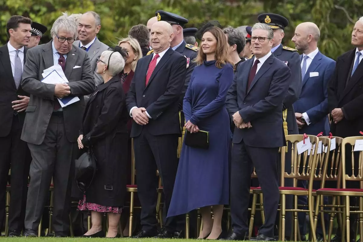 From front right, Britain's Prime Minister Keir Starmer, his wife Victoria Starmer and Britain's Defense Secretary John Healey take their places to watch a Beating Retreat musical performance on the East Lawn of Windsor Castle, in Windsor, England, Wednesday, Sept. 17, 2025. (AP Photo/Evan Vucci)