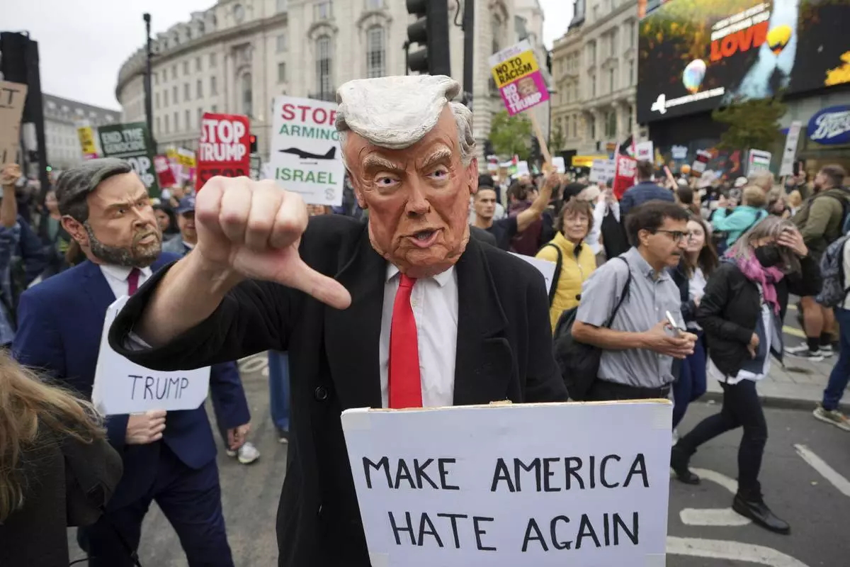 Protesters join a demonstration of the Stop Trump Coalition group against President Donald Trump's state visit in London, Wednesday, Sept. 17, 2025.(AP Photo/Joanna Chan)