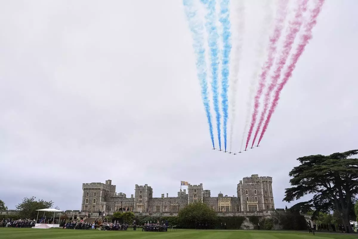The Red Arrows fly in formation over Windsor Castle during the State visit of President Donald Trump and first lady Melania Trump in Windsor, England, Wednesday, Sept. 17, 2025. (AP Photo/Evan Vucci)