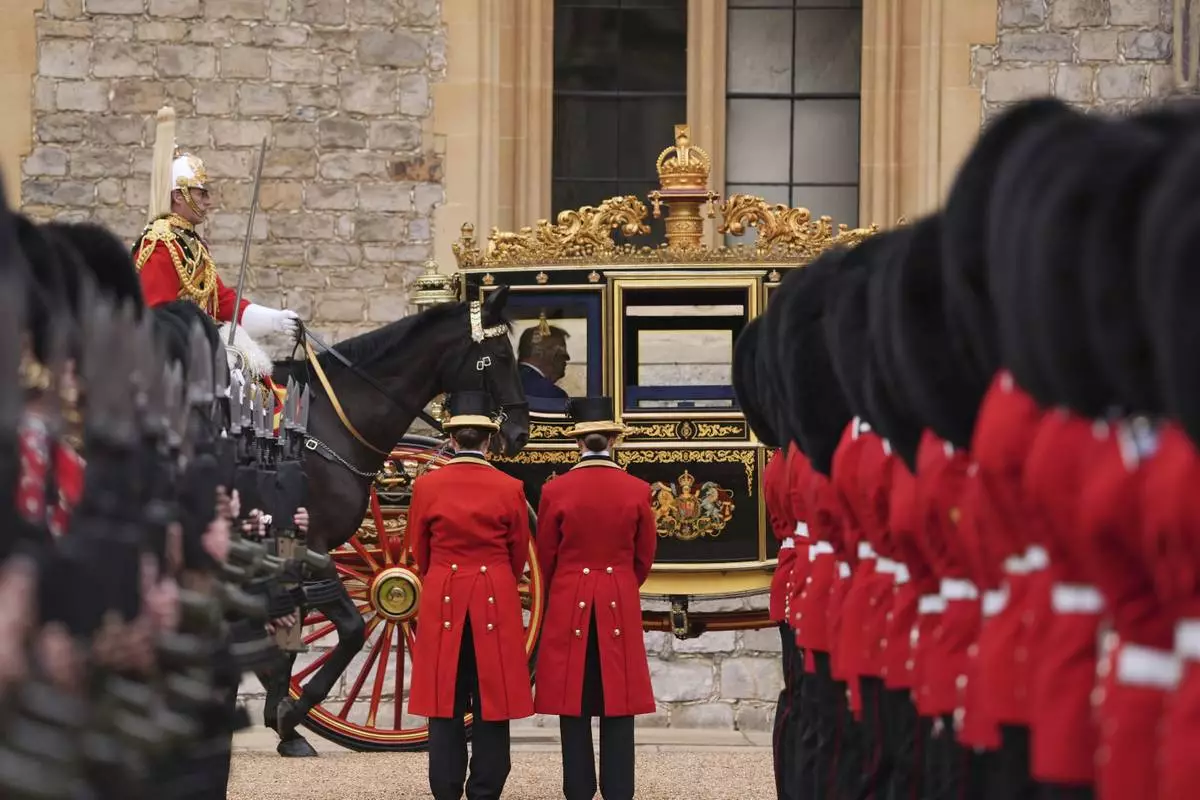 President Donald Trump and Britain's King Charles III arrive in the Irish State Coach during an arrival ceremony at Windsor Castle, in Windsor, England, Wednesday, Sept. 17, 2025. (AP Photo/Evan Vucci)