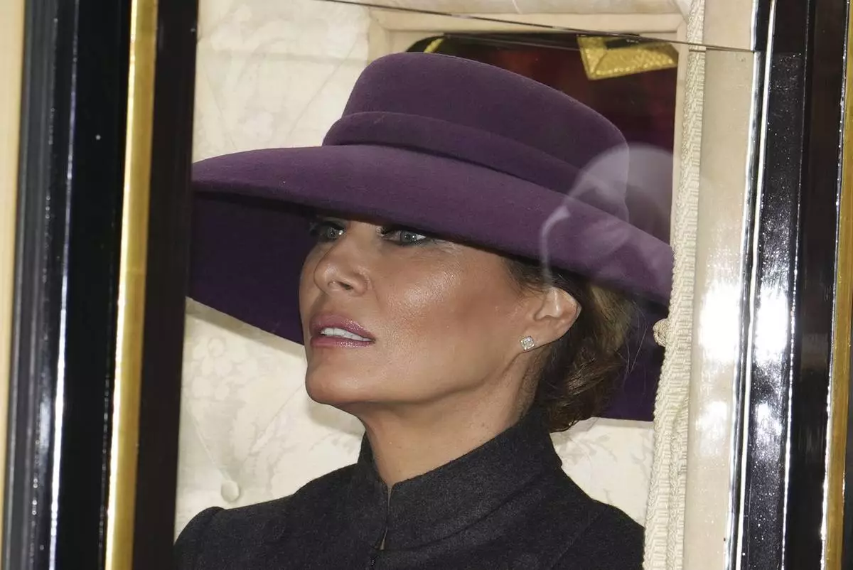 First Lady Melania Trump rides in a carriage procession with Britain's Queen Camilla to Windsor Castle, England, Wednesday, Sept. 17, 2025. (Jordan Pettitt/Pool Photo via AP)