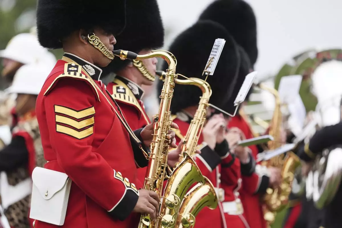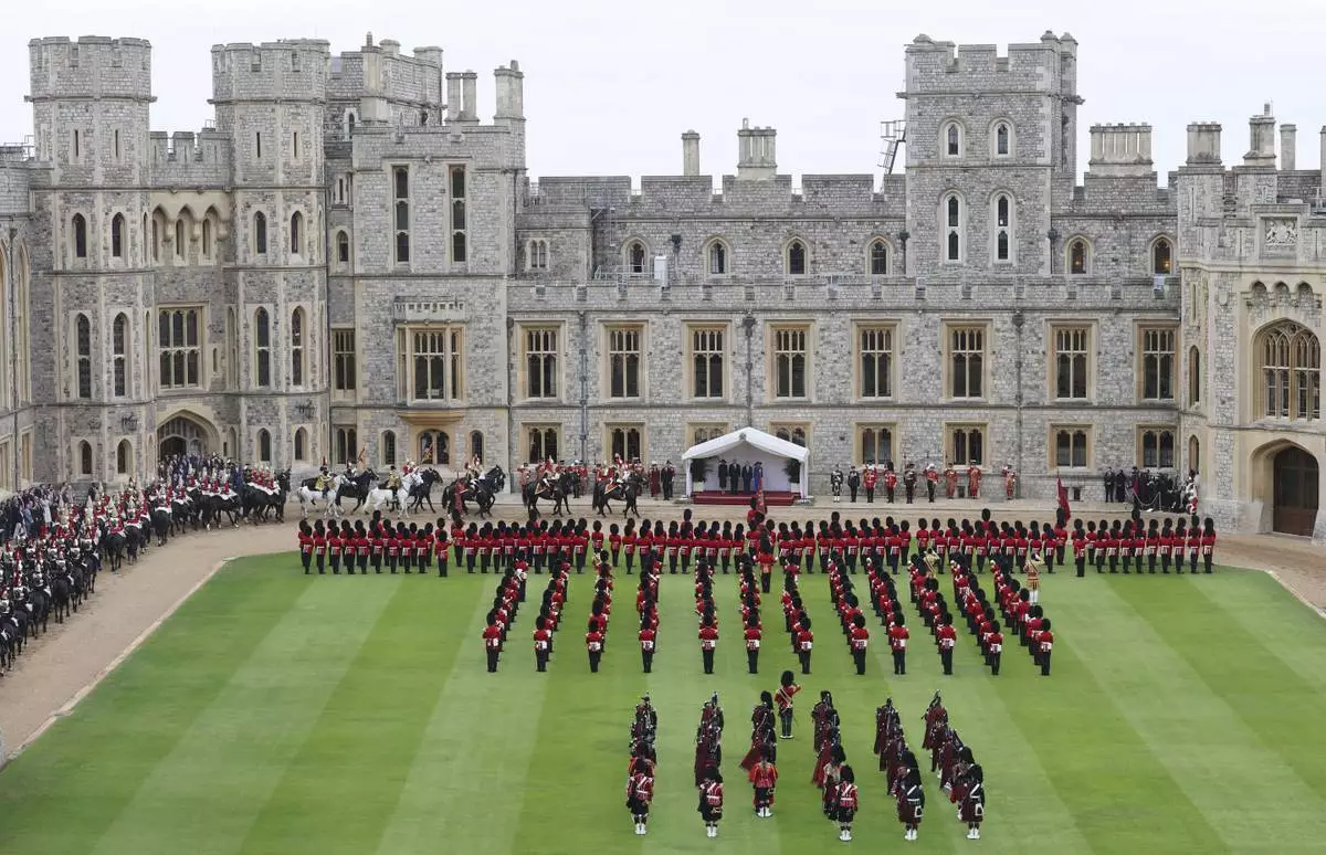 Musicians play during a Beating Retreat musical performance on the East Lawn of Windsor Castle, in Windsor, England, Wednesday, Sept. 17, 2025. (AP Photo/Evan Vucci)