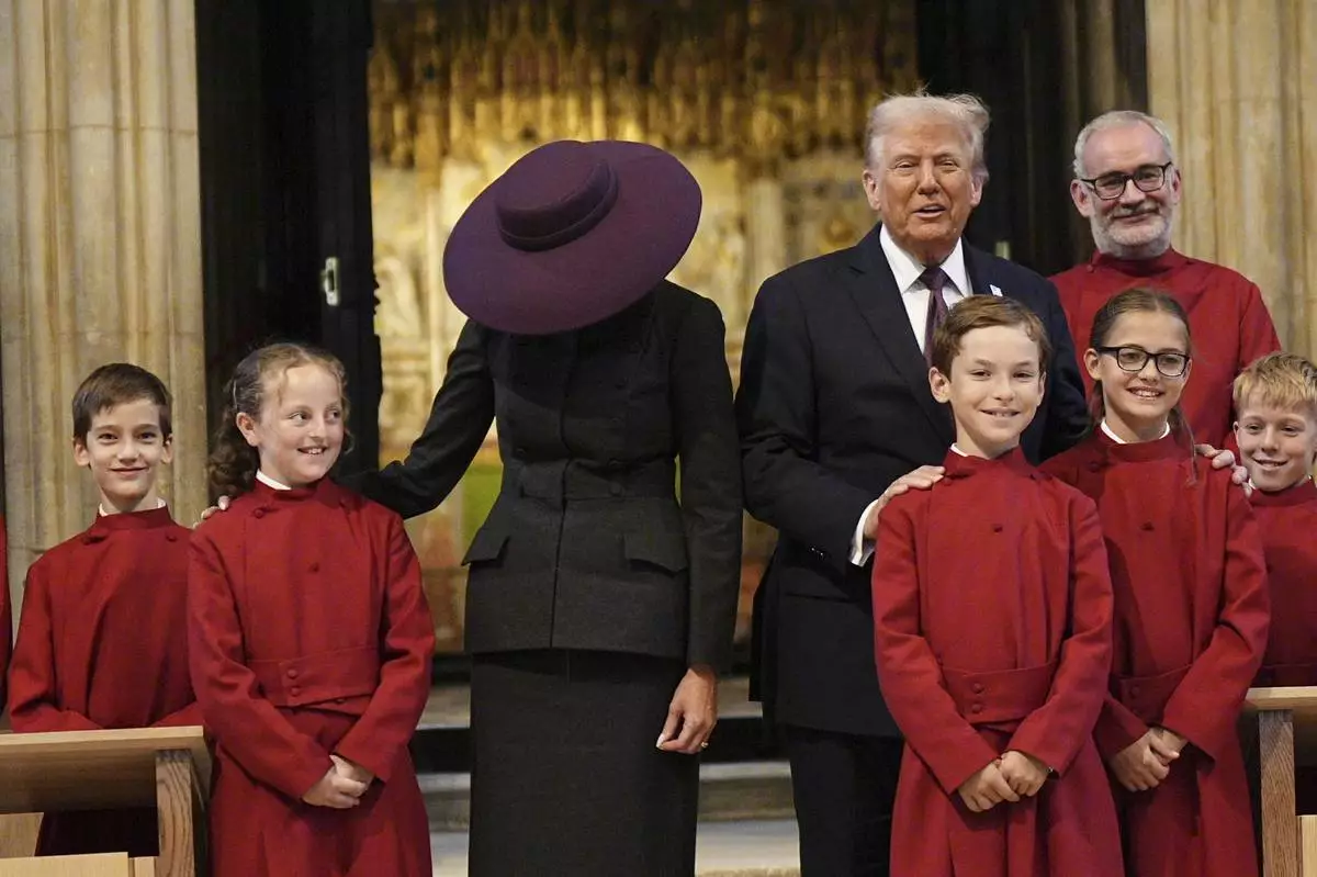 President Donald Trump and first lady Melania Trump pose with a childrens choir as they receive a tour of St. George's Chapel at Windsor Castle, Windsor, England, Wednesday, Sept. 17, 2025. (AP Photo/Evan Vucci, Pool)