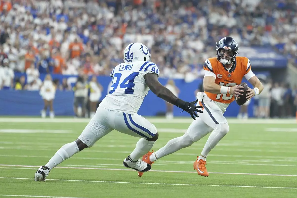 Denver Broncos quarterback Bo Nix (10) looks to throw against Indianapolis Colts defensive end Tyquan Lewis (94) during the first half an NFL football game, Sunday, Sept. 14, 2025, in Indianapolis. (AP Photo/AJ Mast)