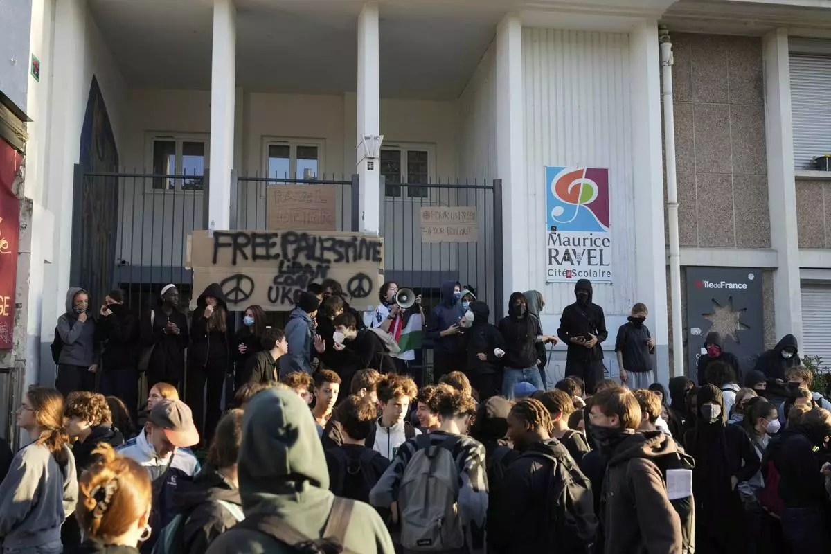 Students block the entrance of a school during a protest called by major trade unions to oppose budget cuts, in Paris, France, Thursday, Sept. 18, 2025. (AP Photo/Michel Euler)