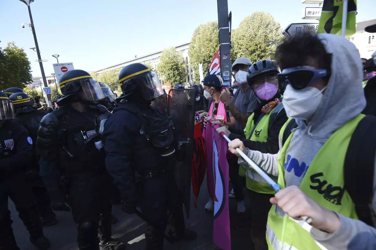 Police officers face protesters during a demonstration called by major trade unions to oppose budget cuts, in Paris, France, Thursday, Sept. 18, 2025. (AP Photo/Thibault Camus)