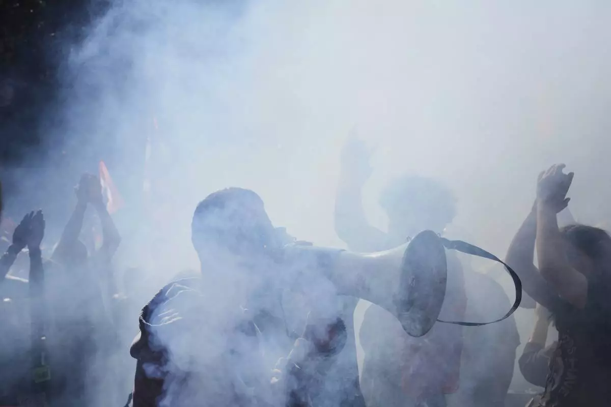 Protesters march in the teargas during a demonstration called by major trade unions to oppose budget cuts, in Paris, France, Thursday, Sept. 18, 2025. (AP Photo/Thibault Camus)