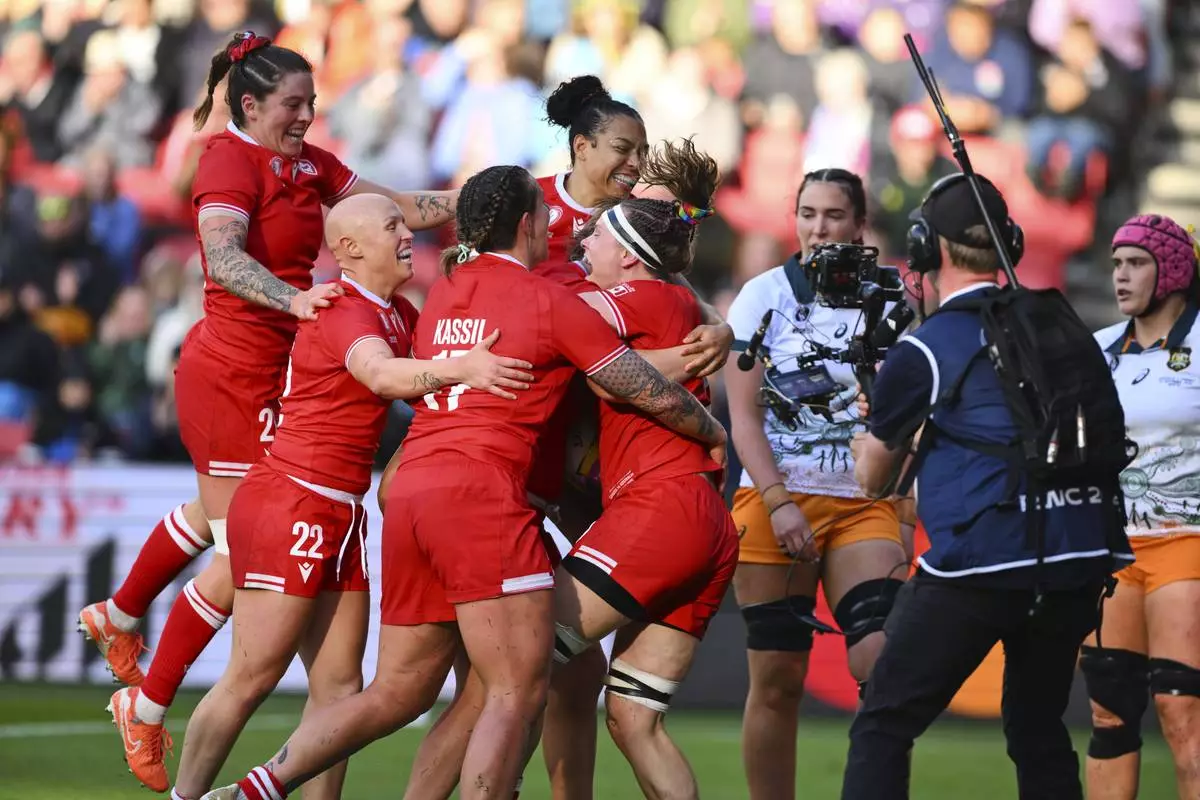 Canada's players celebrates a try during the Women's Rugby World Cup 2025 quarterfinal match between Canada and Australia, in Bristol, England, Saturday, Sept. 13, 2025. (AP Photo/Anthony Upton)