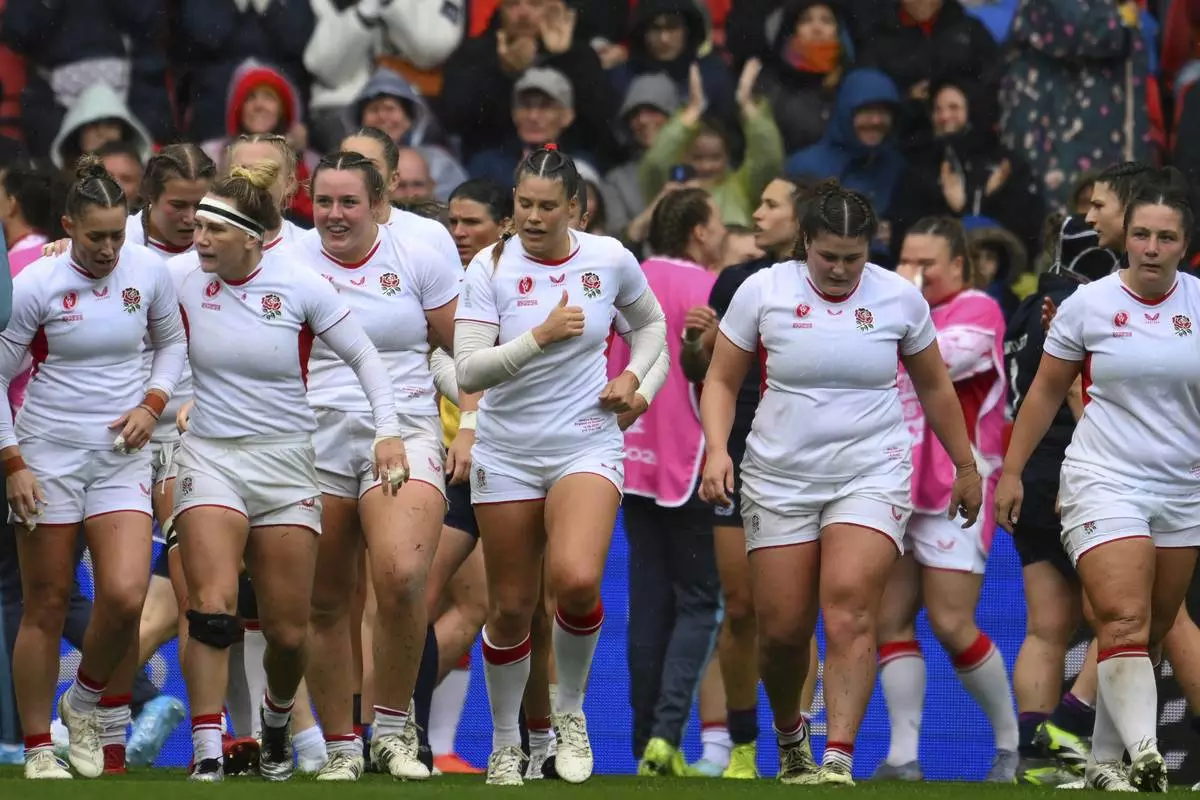 France's players leave the field after their warm up ahead of a Women's Rugby World Cup 2025 quarterfinal match between France and Ireland, in Exeter, England, Sunday, Sept. 14, 2025. (AP Photo/Alastair Grant)