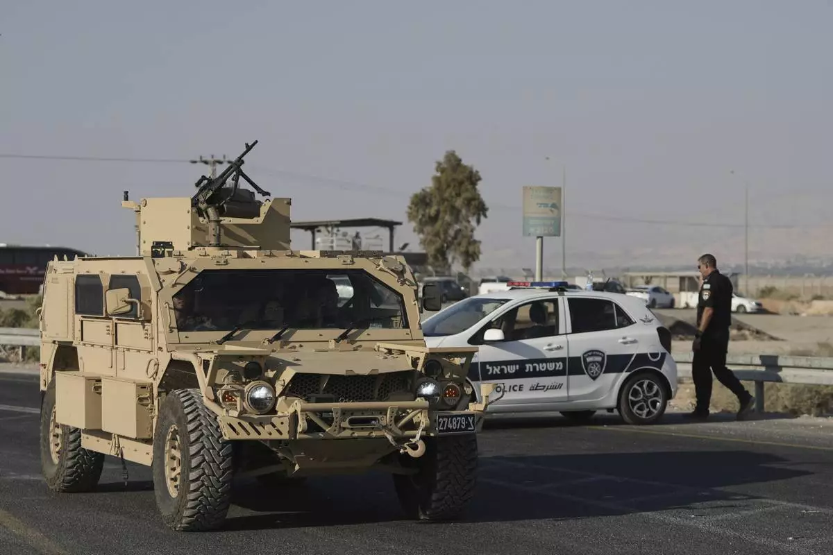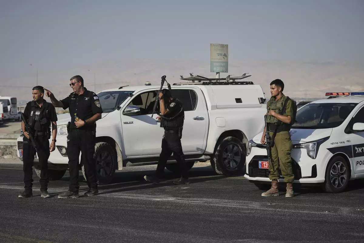 Israeli police and soldiers stand guard near the site of a shooting attack where Israeli officials say two people were shot and killed in a militant attack at the Allenby Bridge Crossing between the West Bank and Jordan, Thursday, Sept. 18, 2025. (AP Photo/Mahmoud Illean)