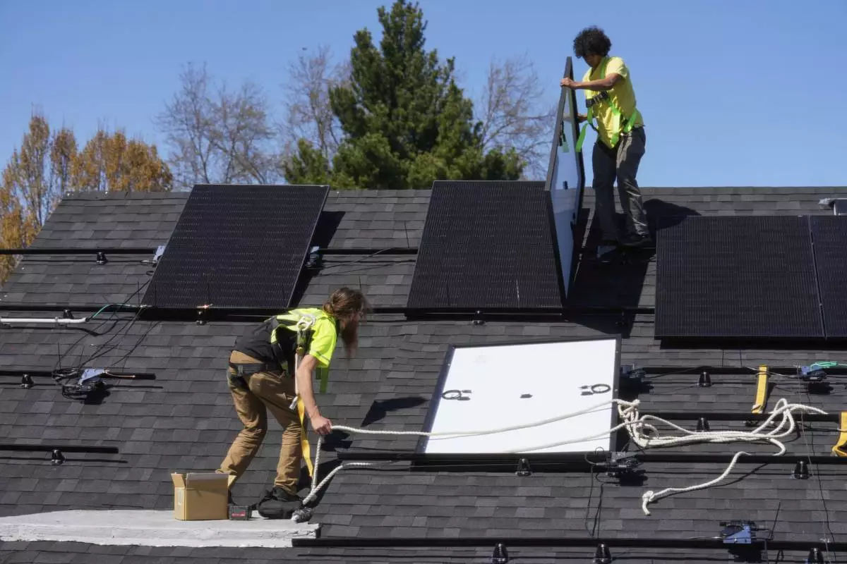 FILE - Theodore Tanczuk, left, and Brayan Santos, right, of solar installer YellowLite, put panels on the roof of a home in Lakewood, Ohio, April 16, 2025. (AP Photo/Sue Ogrocki, File)