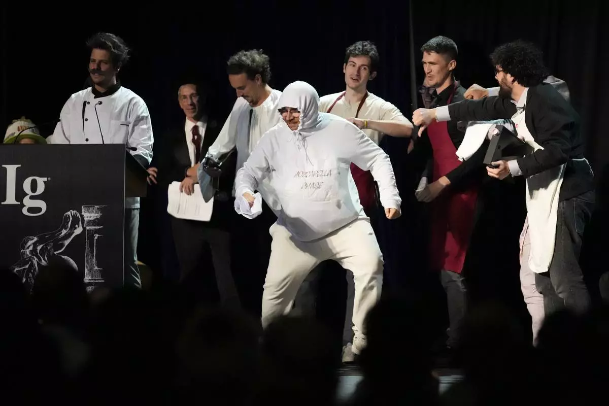 Among the most animated of the winners was a team of researchers from several European countries who studied the physics of pasta sauce. One of the researchers wore a cook’s outfit with a fake mustache to accept the award while another dressed as a big ball of mozzarella cheese got pummeled by several people holding wooden cookware. They ended by handing out bowls of pasta to the Nobel laureates.
