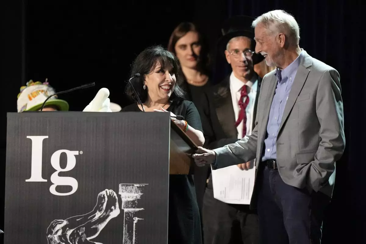 The Ig Nobel Prize for pediatrics is accepted by Julie Mennella and Gary Beauchamp, for studying what a nursing baby experiences when the baby's mother eats garlic, Thursday, Sept. 18, 2025, in Boston. (AP Photo/Robert F. Bukaty)