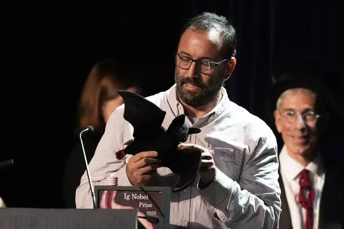 The Ig Nobel Prize for aviation is accepted by Francisco Sanchez for studying whether ingesting alcohol can impair bats' ability to fly, Thursday, Sept. 18, 2025, in Boston. (AP Photo/Robert F. Bukaty)