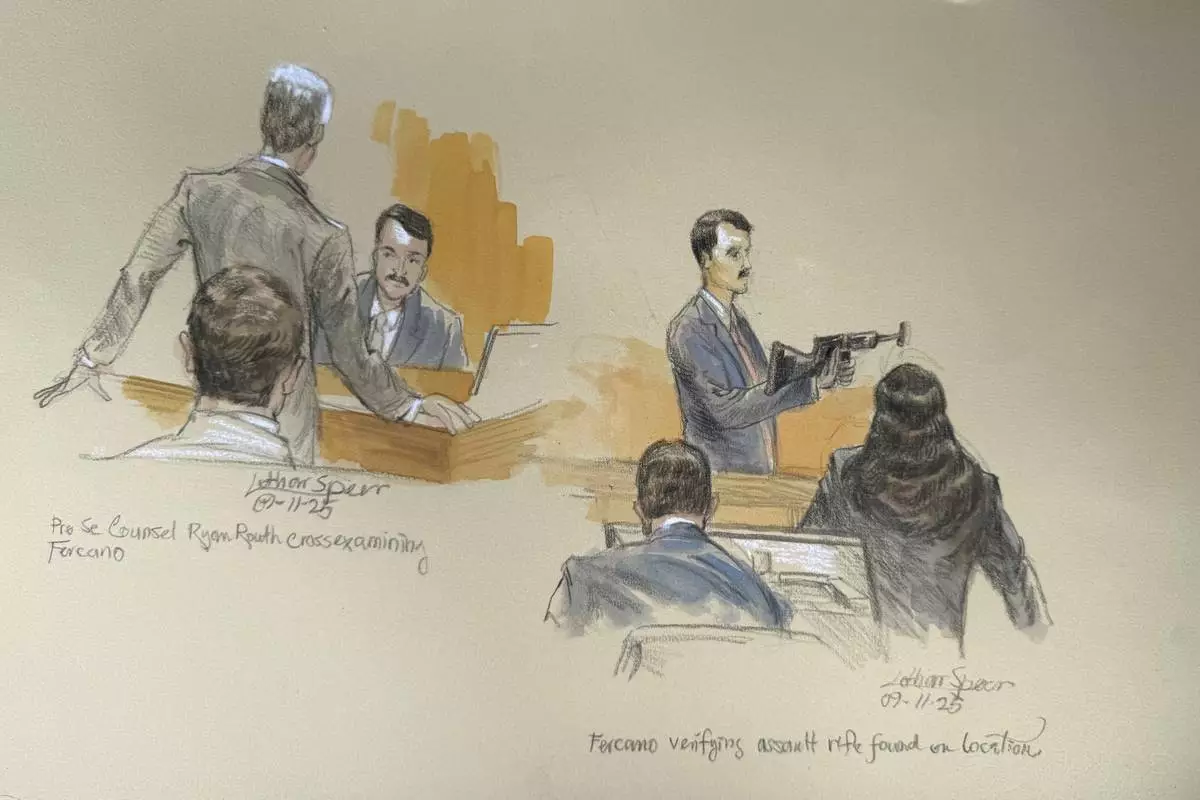 This courtroom sketch shows Secret Service agent Robert Fercano identifying the defendant in the trial of Ryan Routh, who is charged with attempting to assassinate Donald Trump last year at a golf course in South Florida, Thursday, Sept. 11, 2025, in Fort Pierce, Fla. (Lothar Speer via AP)