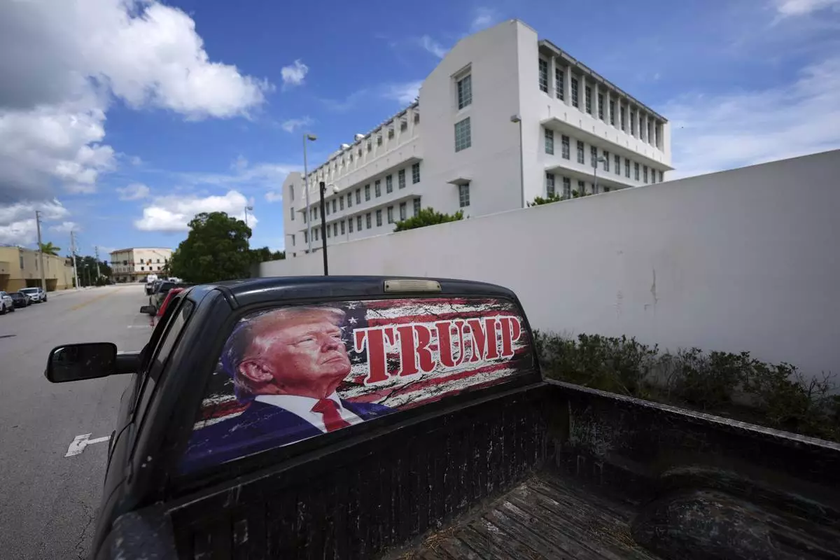 A pickup truck decorated in support of President Donald Trump sits parked outside the Alto Lee Adams Sr. U.S. Courthouse, after the start of jury selection in the trial of Ryan Routh, charged with trying to assassinate Trump while he played golf last year in South Florida, Monday, Sept. 8, 2025, in Fort Pierce, Fla. (AP Photo/Rebecca Blackwell)