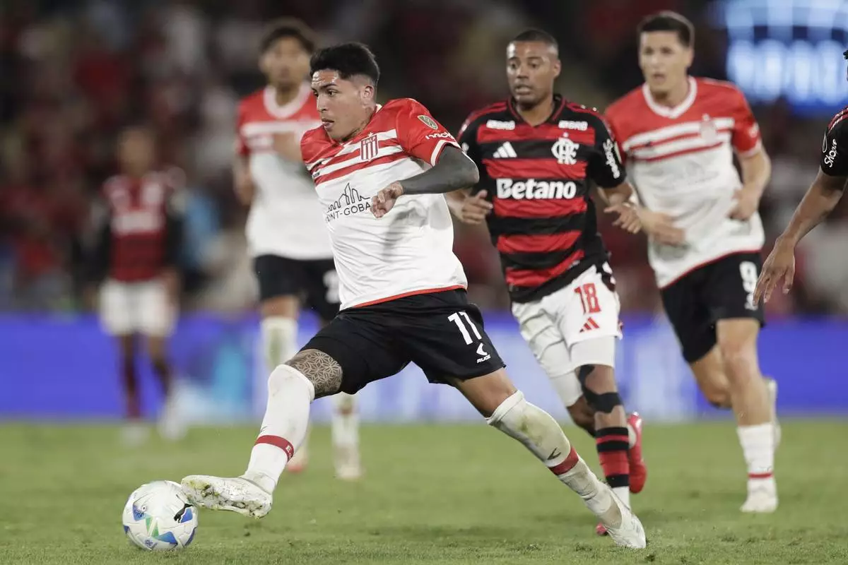 Facundo Farias of Argentina's Estudiantes de La Plata, left, controls the ball during a Copa Libertadores quarterfinal soccer match against Brazil's Flamengo at Maracana stadium, in Rio de Janeiro, Thursday, Sept. 18, 2025. (AP Photo/Bruna Prado)