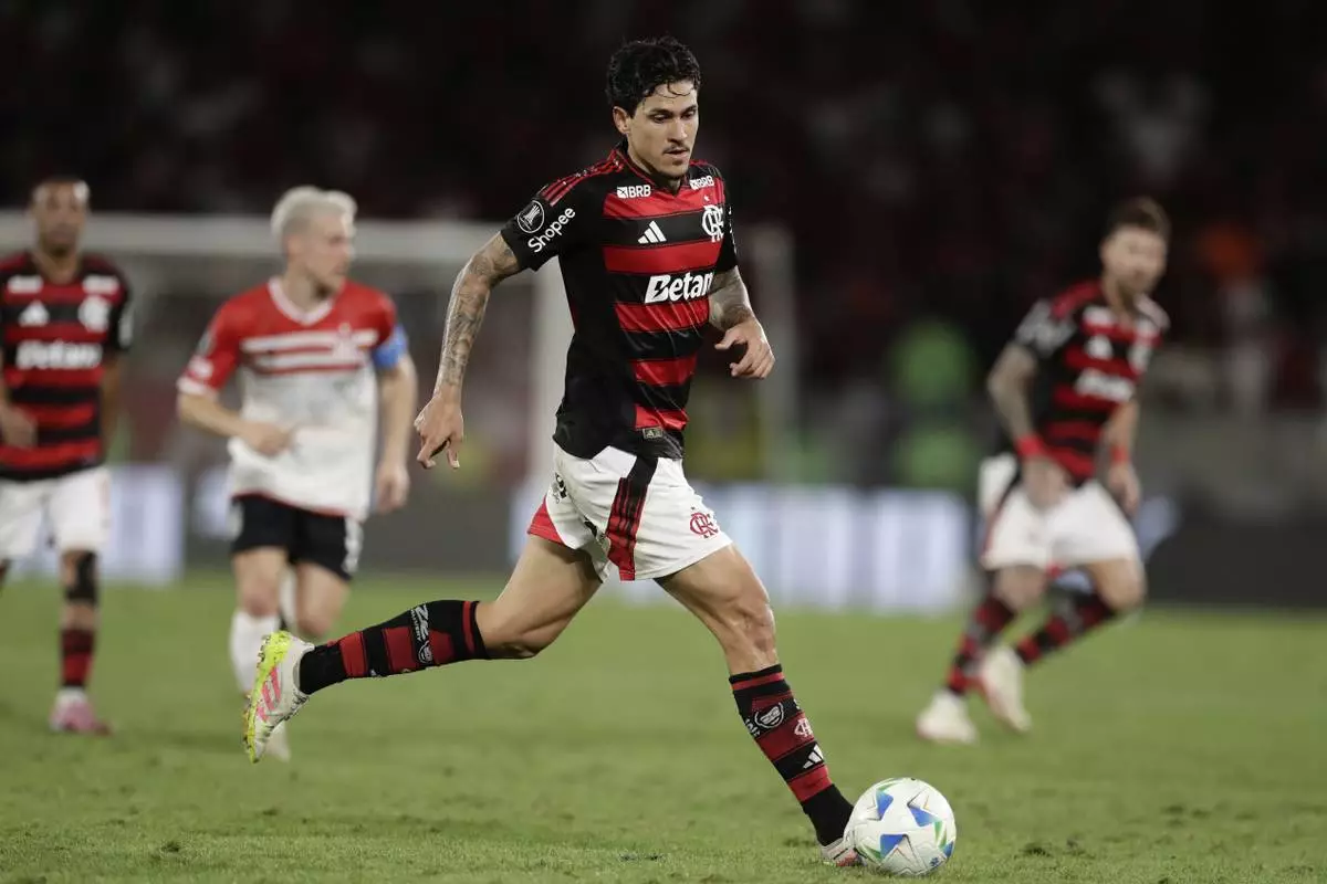 Pedro of Brazil's Flamengo controls the ball during a Copa Libertadores quarterfinal soccer match against Argentina's Estudiantes de La Plata at Maracana stadium, in Rio de Janeiro, Thursday, Sept. 18, 2025. (AP Photo/Bruna Prado)