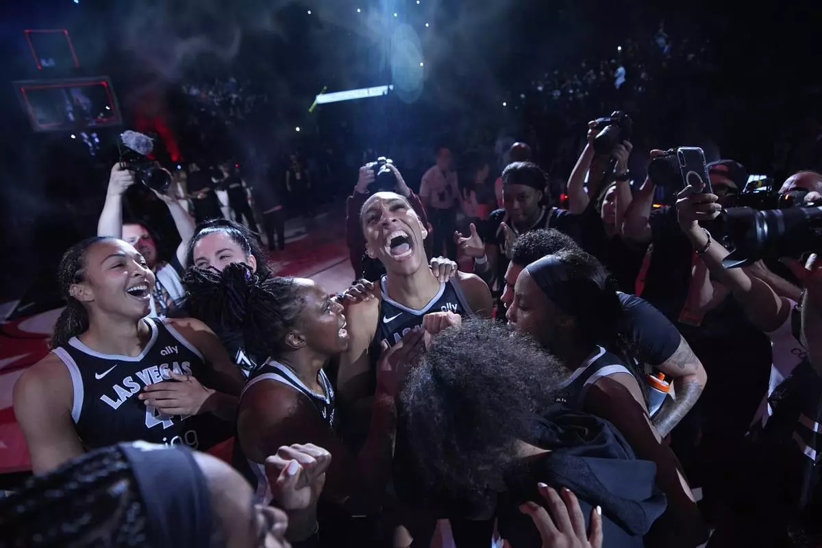 Las Vegas Aces center A'ja Wilson, center, celebrates with teammates after defeating the Seattle Storm in Game 3 in the first round of the WNBA basketball playoffs Thursday, Sept. 18, 2025, in Las Vegas. (AP Photo/John Locher)