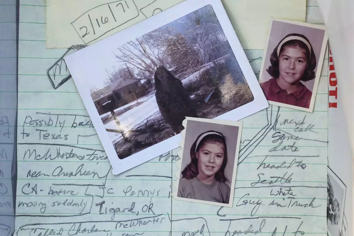 A school photo of Marion Vinetta Nagle McWhorter, who disappeared in 1974 in Oregon and whose remains were recently confirmed by DNA from her sister Valerie Nagle, is seen over notes taken by Nagle about McWhorter's disappearance Thursday, Sept. 18, 2025, in Seattle. (AP Photo/Lindsey Wasson)