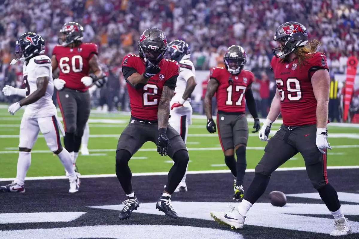 Tampa Bay Buccaneers wide receiver Emeka Egbuka (2) Sterling Shepard (17) and Cody Mauch (69) celebrate after Egbuka scored a touchdown in the first half of an NFL football game against the Houston Texans Monday, Sept. 15, 2025, in Houston, Texas. (AP Photo/Eric Christian Smith)
