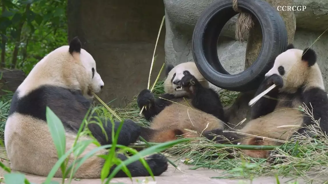 Recently-released camera footage showed three adorable giant pandas are enjoying their meal together, creating a warm and harmonious scene.