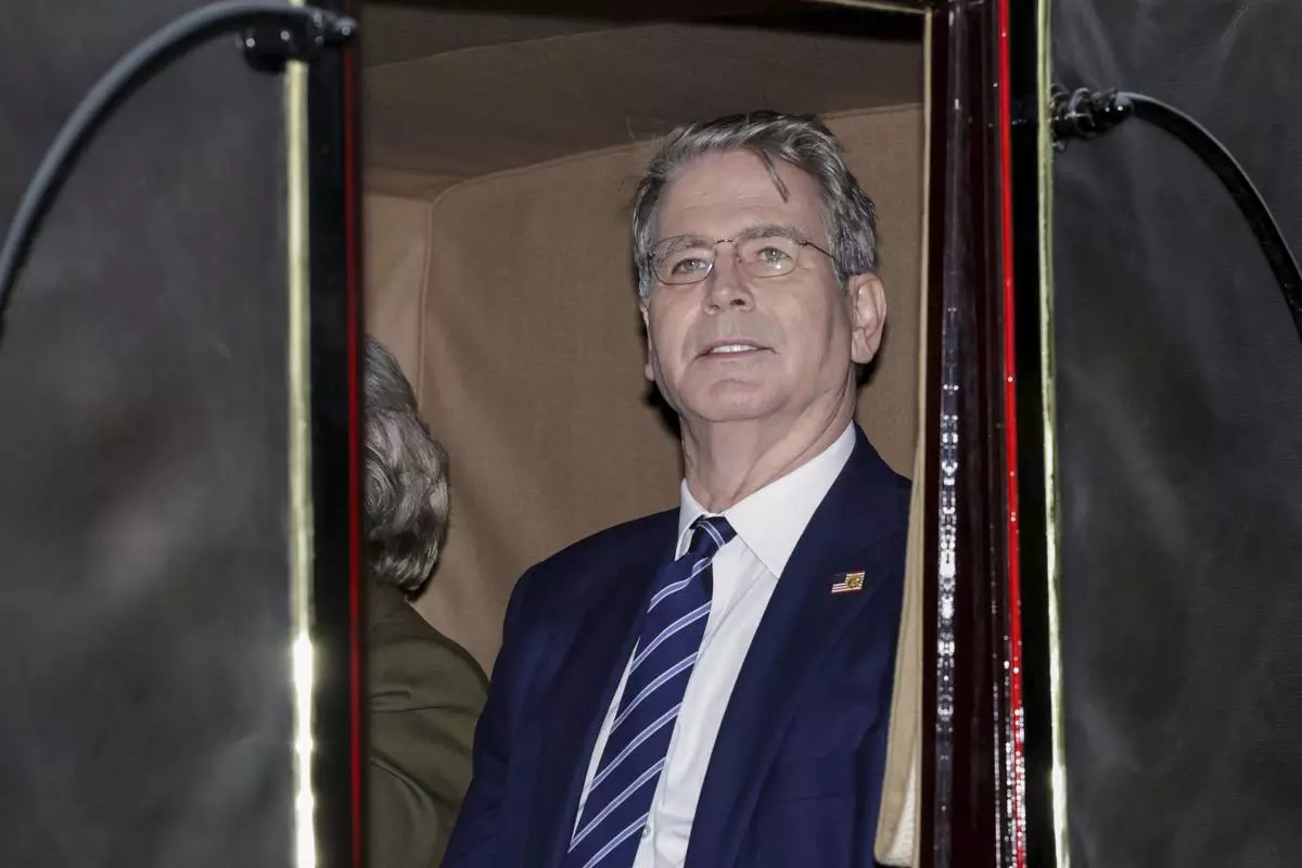 US Treasury Secretary Scott Bessent rides in a carriage during a procession through Windsor Castle on the occasion of President Donald Trump's visit, in Windsor, England, Wednesday, Sept. 17, 2025. (Toby Melville/Pool Photo via AP)