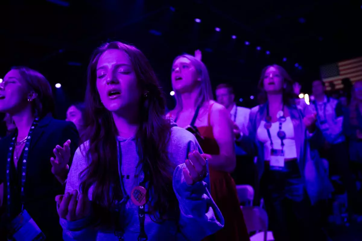 Attendees sing and pray during Faith Night worship events at Turning Point USA's AmericaFest 2025, Saturday, Dec. 20, 2025, in Phoenix. (AP Photo/Jon Cherry)