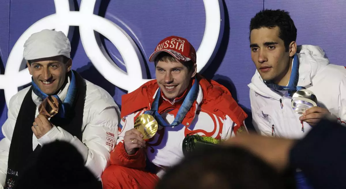 FILE - Russia's gold medal winner Evgeny Ustyugov is flanked by France's silver medal winner Martin Fourcade, right, and Slovakia's bronze medal winner Pavol Hurajt during the medal ceremony for the Men's 15k mass start Biathlon race at the Vancouver 2010 Olympics in Whistler, British Columbia, Canada, Sunday, Feb. 21, 2010. (AP Photo/Dmitry Lovetsky, File)