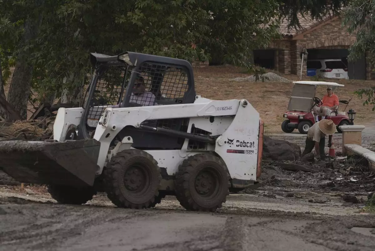 Workers and residents clean up the damage caused by mudslides after storms in Yucaipa, Calif., Friday, Sept. 19, 2025. (AP Photo/Damian Dovarganes)