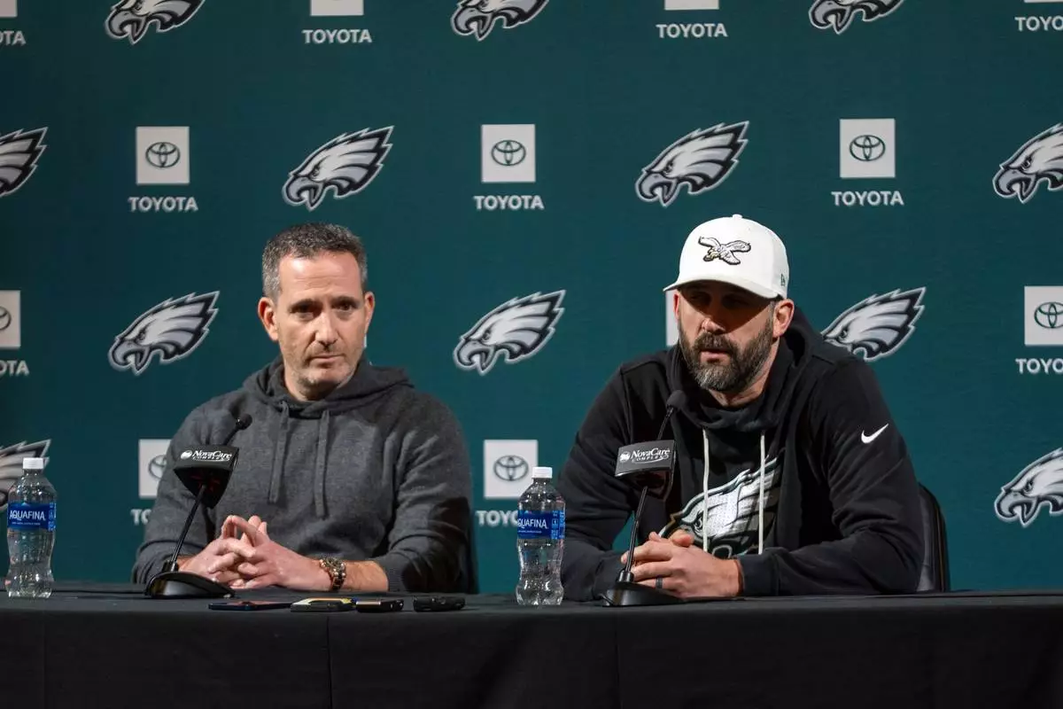 Philadelphia Eagles executive vice president and general manager Howie Roseman, left, looks over as head coach Nick Sirianni, right, speaks with the media during a news conference at the NFL football team's training facility, Thursday, Jan. 15, 2026, in Philadelphia. (AP Photo/Chris Szagola)