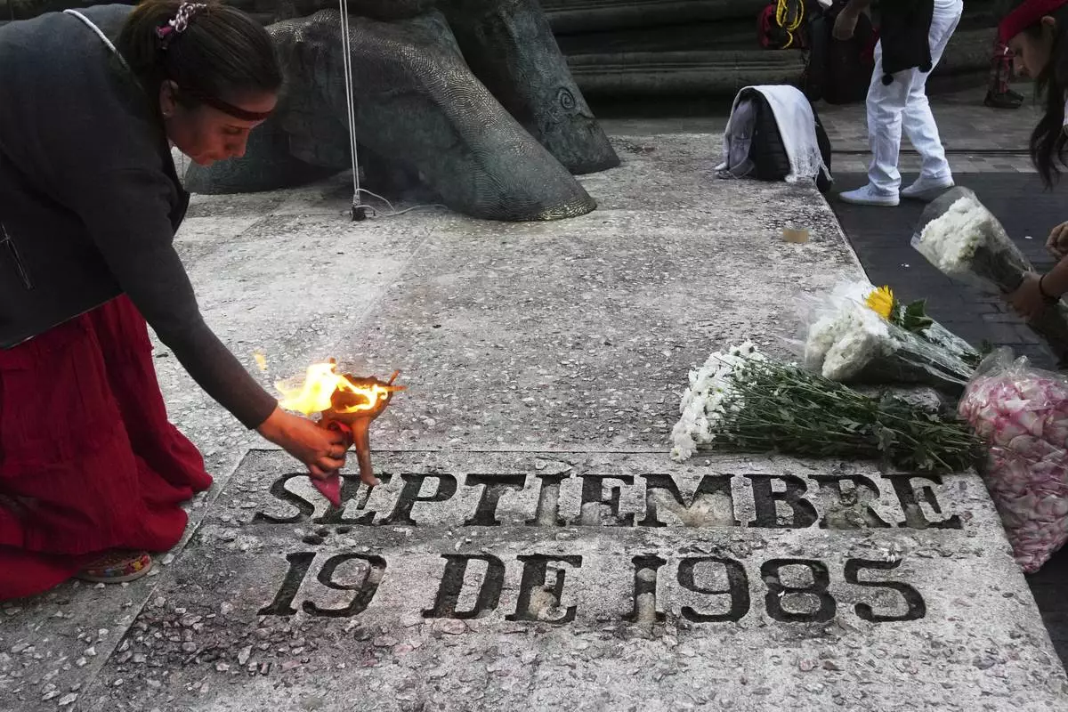 An Indigenous woman uses incense for a blessing at the 1985 earthquake memorial during a ceremony marking the quake's 40th anniversary in Mexico City, Friday, Sept. 19, 2025. (AP Photo/Marco Ugarte)