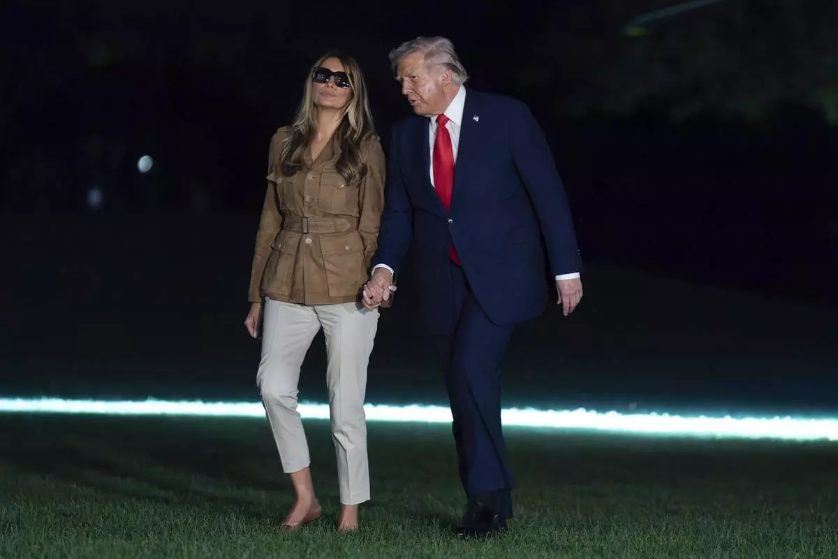 President Donald Trump holds hands with first lady Melania Trump as they walk on the South Lawn upon their arrival to the White House, in Washington, Thursday, Sept. 18, 2025. (AP Photo/Jose Luis Magana)