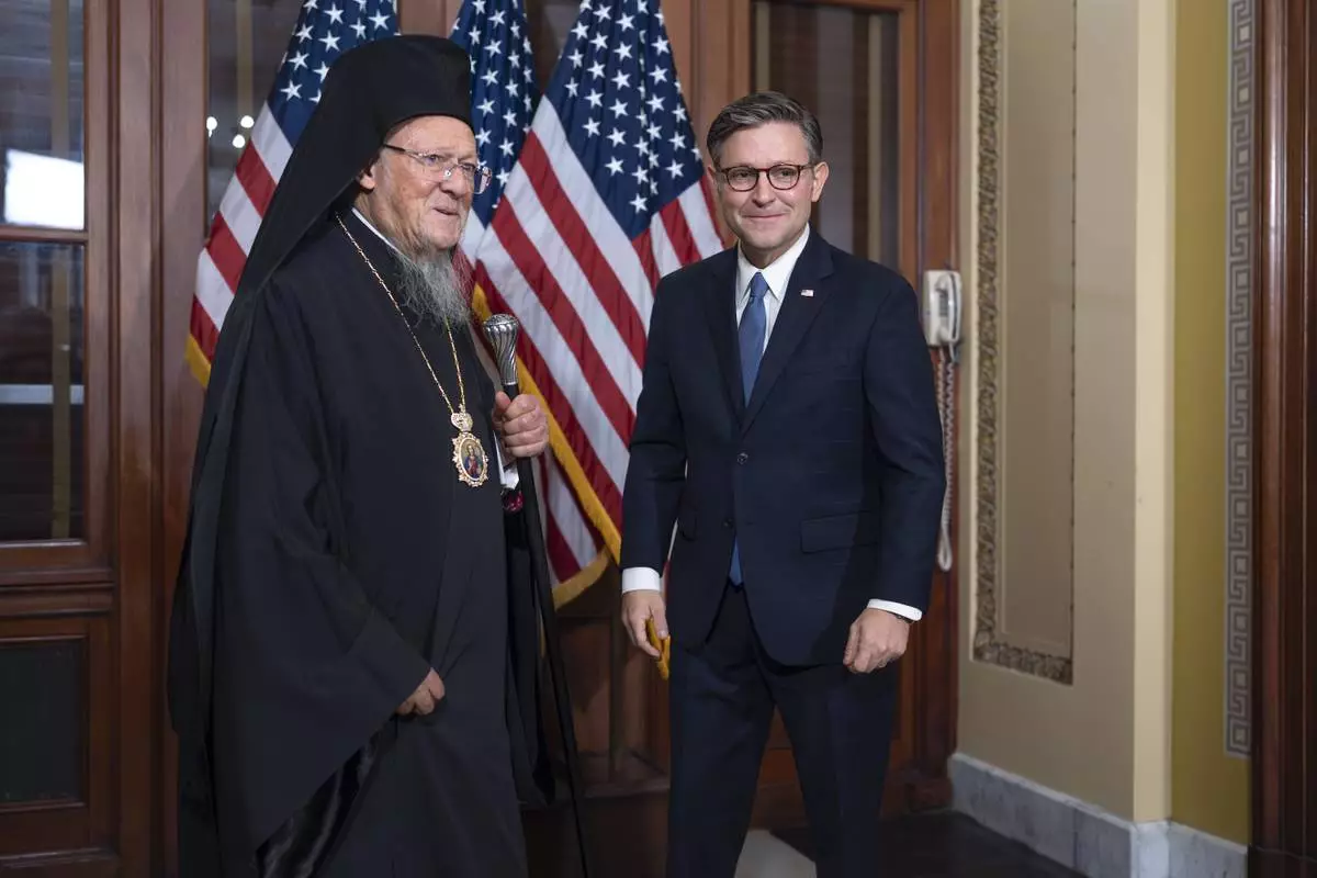 Speaker of the House Mike Johnson, R-La., right, welcomes the leader of the Orthodox Christian Church, Ecumenical Patriarch Bartholomew, left, for a meeting in the speaker's office at the Capitol in Washington, Wednesday, Sept. 17, 2025. (AP Photo/J. Scott Applewhite)