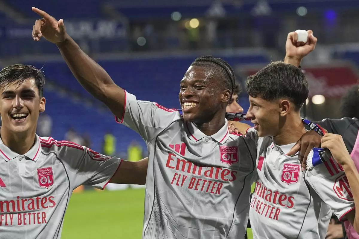 Lyon's Khalis Merah, right, and Lyon's Enzo Molebe, centre, celebrate after the French League One soccer match between Olympique Lyon and Angers at Groupama stadium in Decines, outside Lyon, France, Friday, Sept. 19, 2025. (AP Photo/Laurent Cipriani)