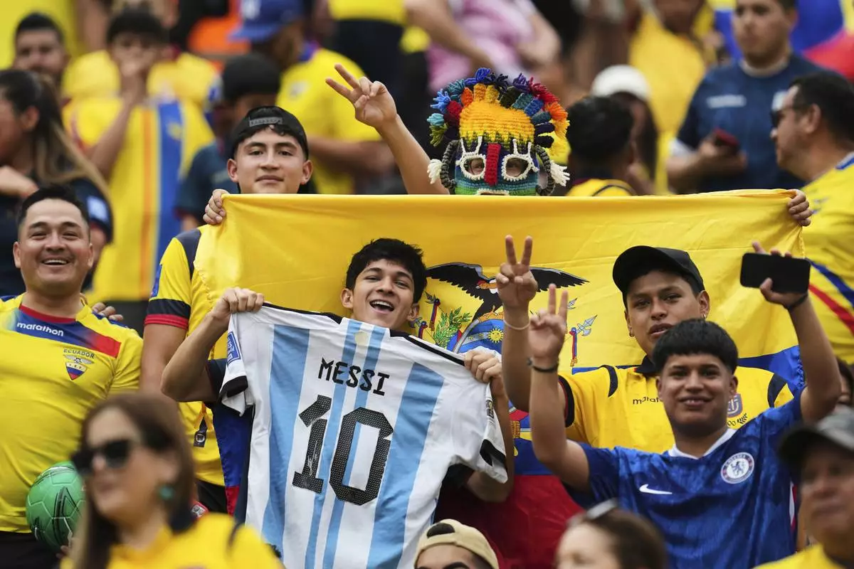 A soccer fan holds a jersey of Argentina's Lionel Messi prior to a World Cup 2026 qualifying soccer match against Ecuador at Banco Pichincha stadium in Guayaquil, Ecuador, Tuesday, Sept. 9, 2025. (AP Photo/Dolores Ochoa)