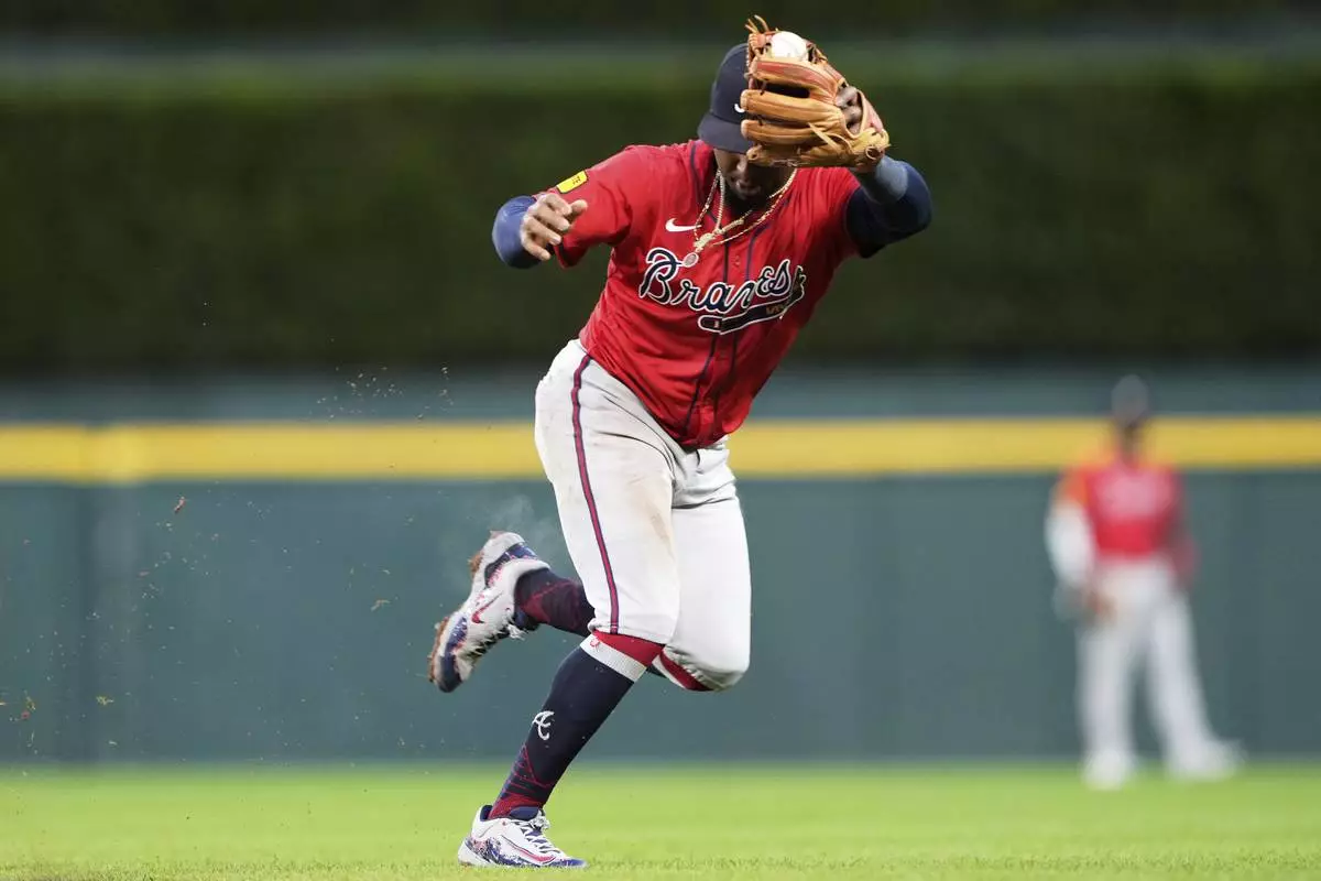 Atlanta Braves second baseman Ozzie Albies fields a ground out from Detroit Tigers' Zach McKinstry during the third inning of a baseball game, Friday, Sept. 19, 2025, in Detroit. (AP Photo/Ryan Sun)