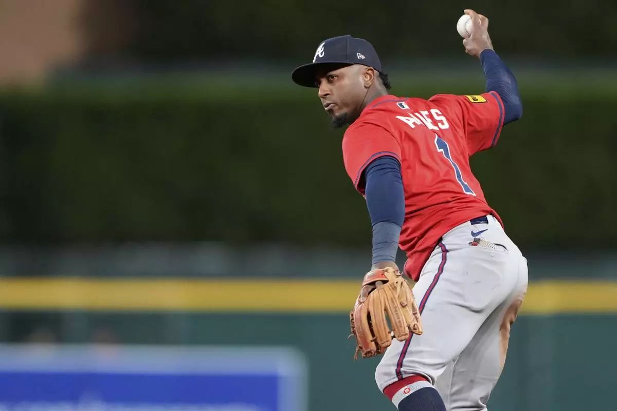 Atlanta Braves second baseman Ozzie Albies prepares to throw out Detroit Tigers' Parker Meadows at first base during the sixth inning of a baseball game, Friday, Sept. 19, 2025, in Detroit. (AP Photo/Ryan Sun)