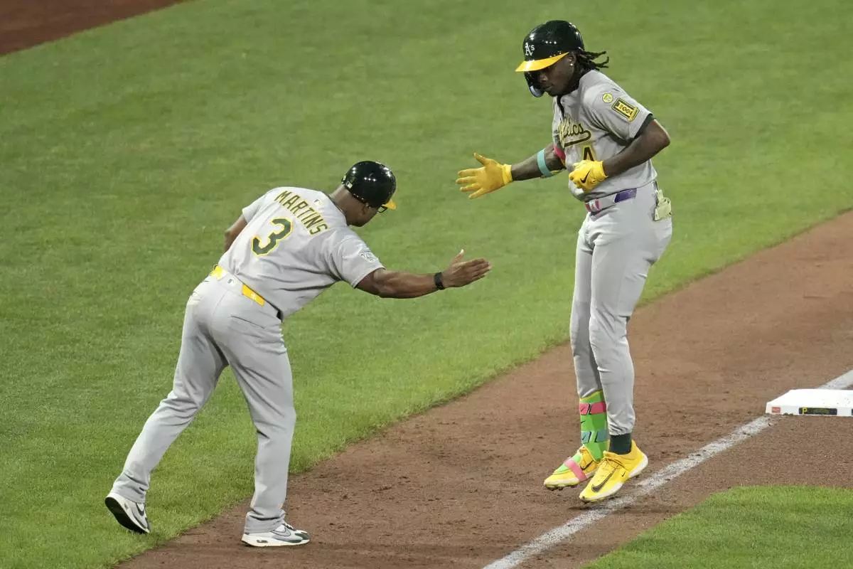 Athletics' Lawrence Butler, right, is greeted by third base coach Eric Martins (3) as he rounds third after hitting a three-run home run off Pittsburgh Pirates pitcher Mitch Keller during the fifth inning of a baseball game in Pittsburgh, Friday, Sept. 19, 2025. (AP Photo/Gene J. Puskar)