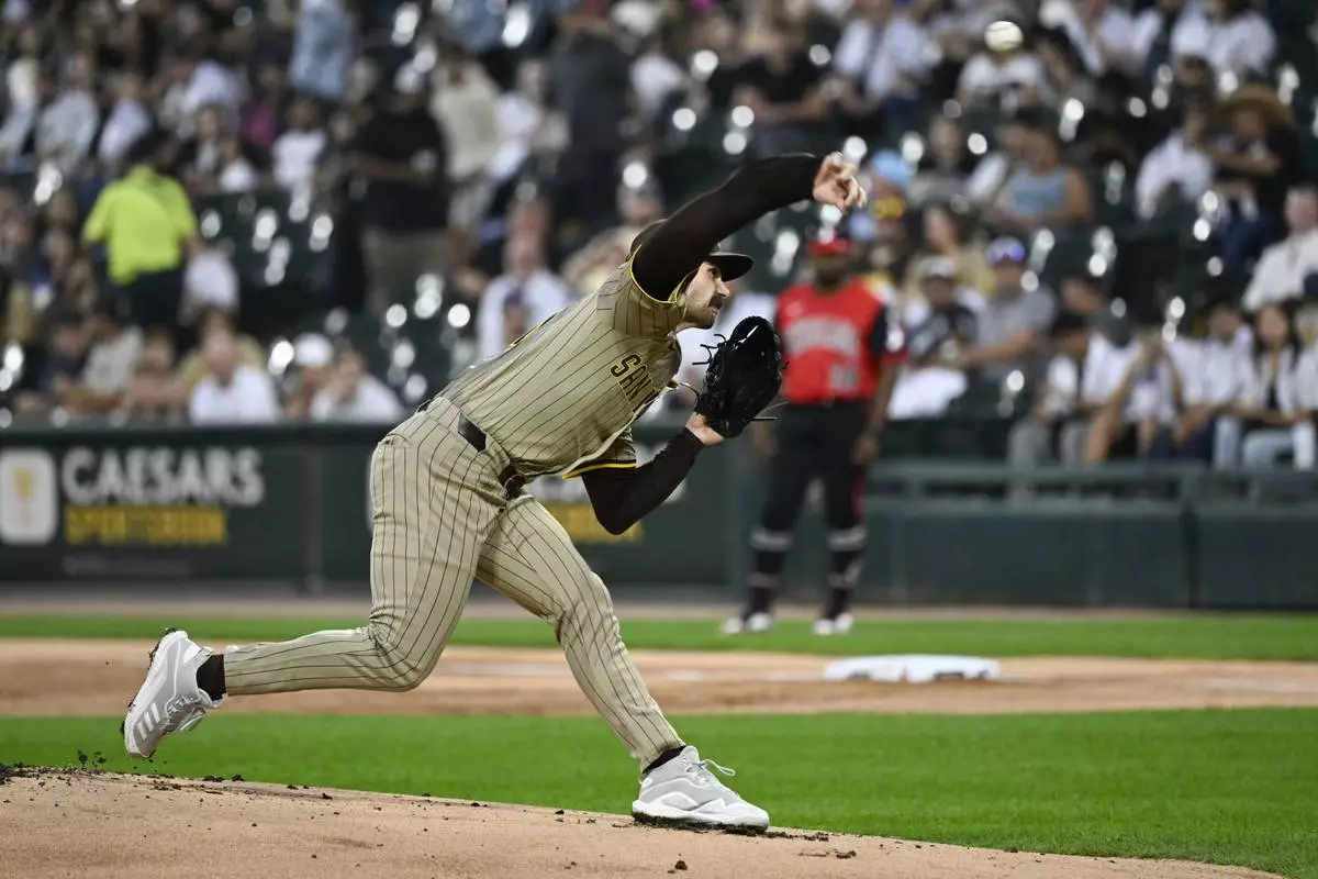 San Diego Padres pitcher Dylan Cease delivers during the first inning of a baseball game against the Chicago White Sox, Friday, Sept. 19, 2025, in Chicago. (AP Photo/Matt Marton)