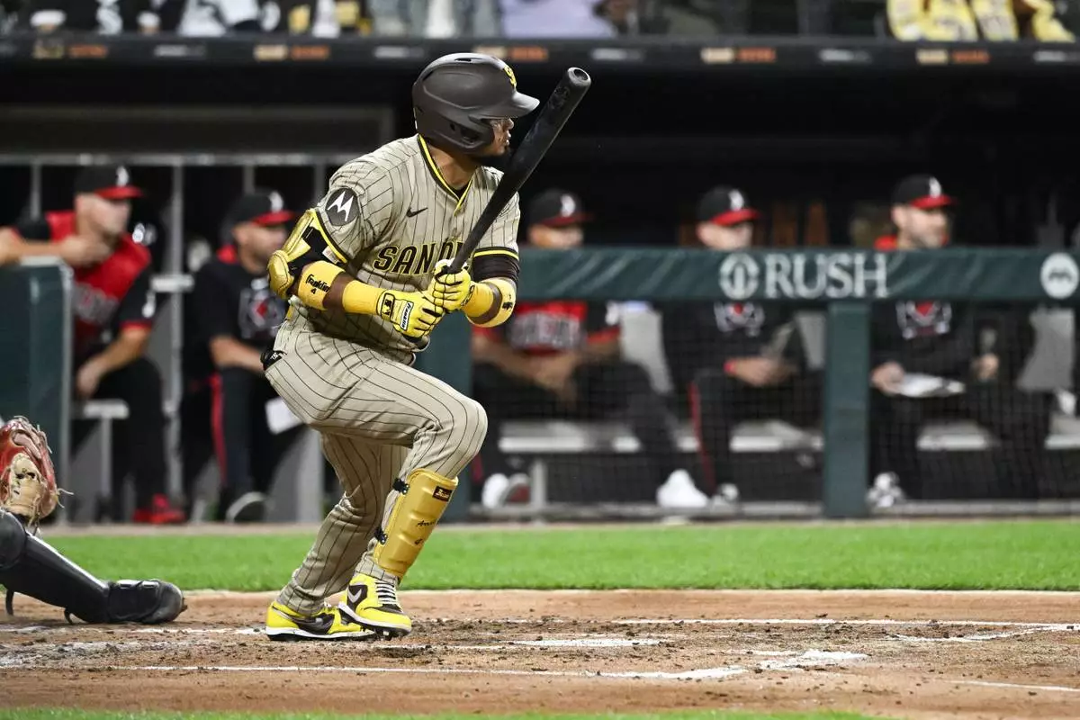 San Diego Padres' Luis Arraez hits an RBI single during the third inning of a baseball game against the Chicago White Sox, Friday, Sept. 19, 2025, in Chicago. (AP Photo/Matt Marton)