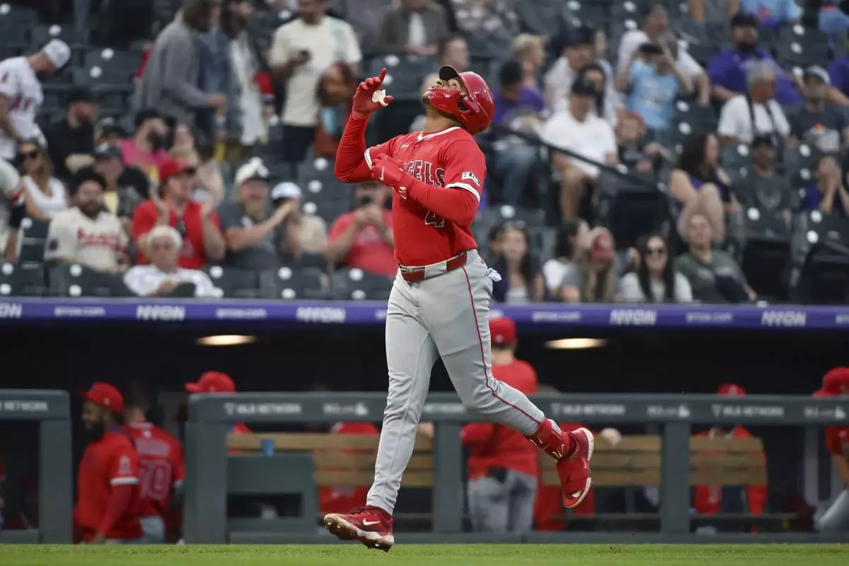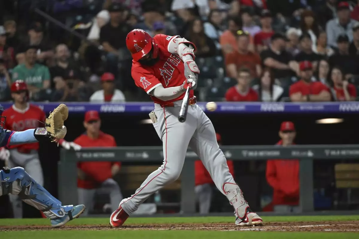 Los Angeles Angels' Jo Adell hits a single in the fourth inning of a baseball game against the Colorado Rockies Friday, Sept. 19, 2025, in Denver. (AP Photo/Geneva Heffernan)