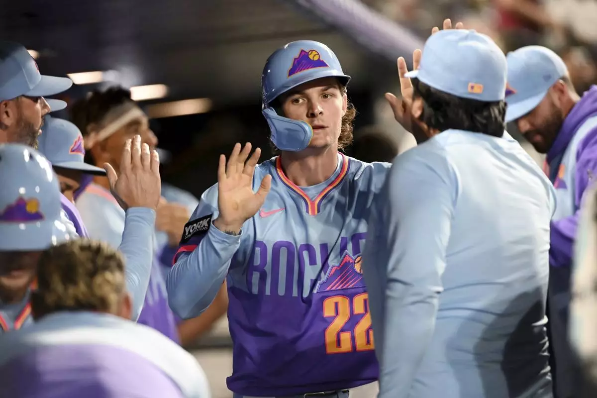 Colorado Rockies' Mickey Moniak (22) celebrates in the dugout after scoring in the fifth inning of a baseball game against the Los Angeles Angels Friday, Sept. 19, 2025, in Denver. (AP Photo/Geneva Heffernan)