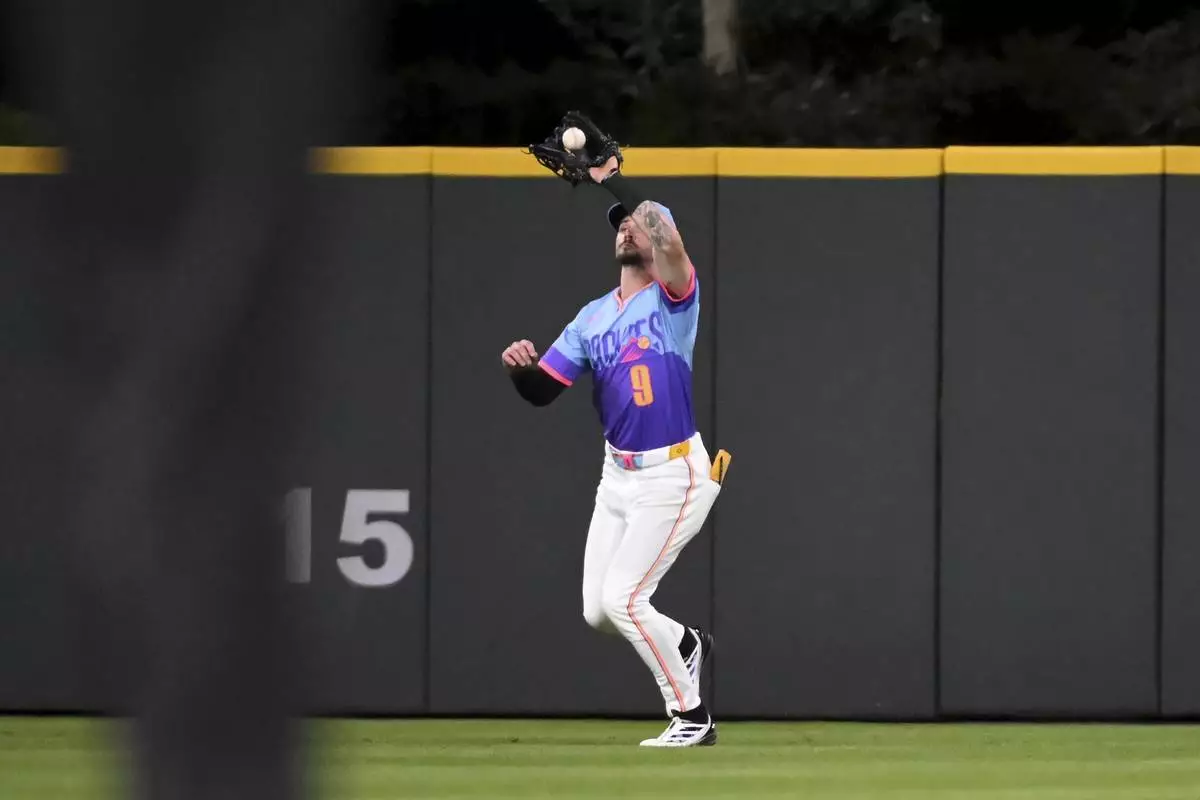 Colorado Rockies center fielder Brenton Doyle catches a sacrifice fly in the fifth inning of a baseball game against the Los Angeles Angels Friday, Sept. 19, 2025, in Denver. (AP Photo/Geneva Heffernan)