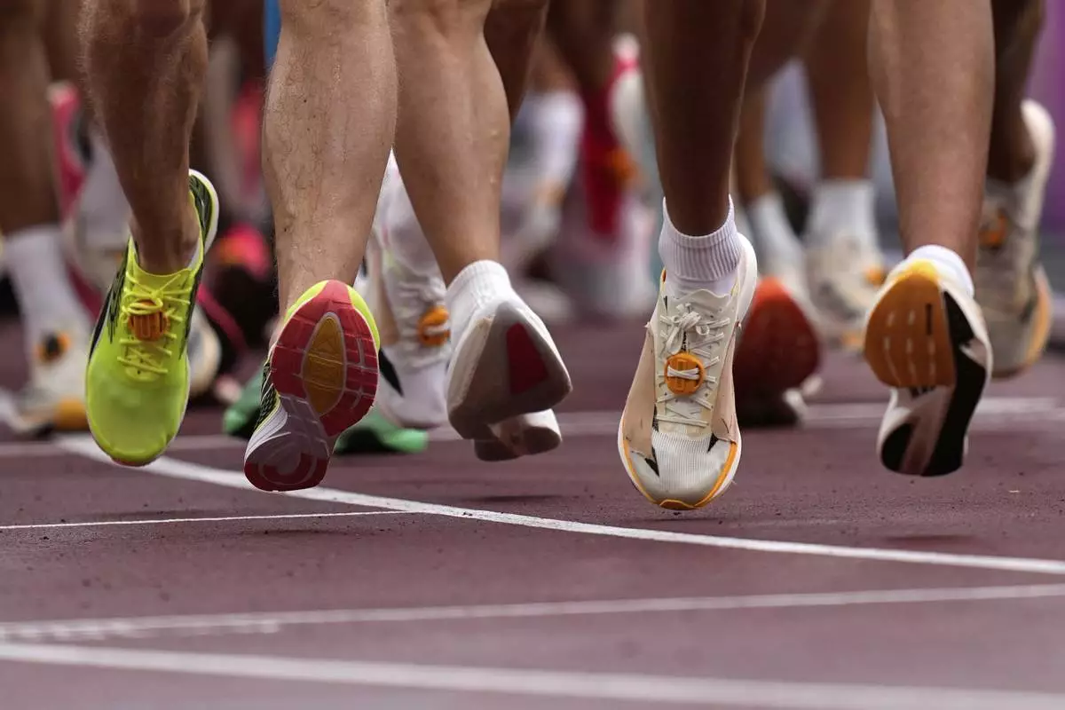Czech Republic's Ondrej Kopecky, top, makes a false start during the decathlon 100 meters at the World Athletics Championships in Tokyo, Saturday, Sept. 20, 2025. (AP Photo/Bernat Armangue)