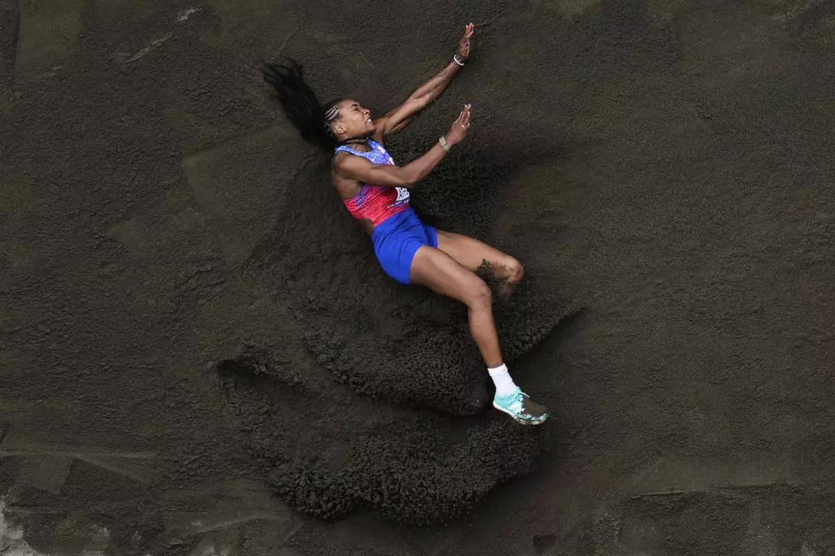 United States' Michelle Atherley competes during the heptathlon long jump at the World Athletics Championships in Tokyo, Saturday, Sept. 20, 2025. (AP Photo/Bernat Armangue)
