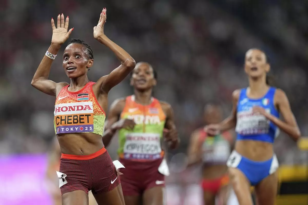 Kenya's Beatrice Chebet celebrates as she wins the gold medal in the women's 5,000 meters final at the World Athletics Championships in Tokyo, Saturday, Sept. 20, 2025. (AP Photo/Petr David Josek)