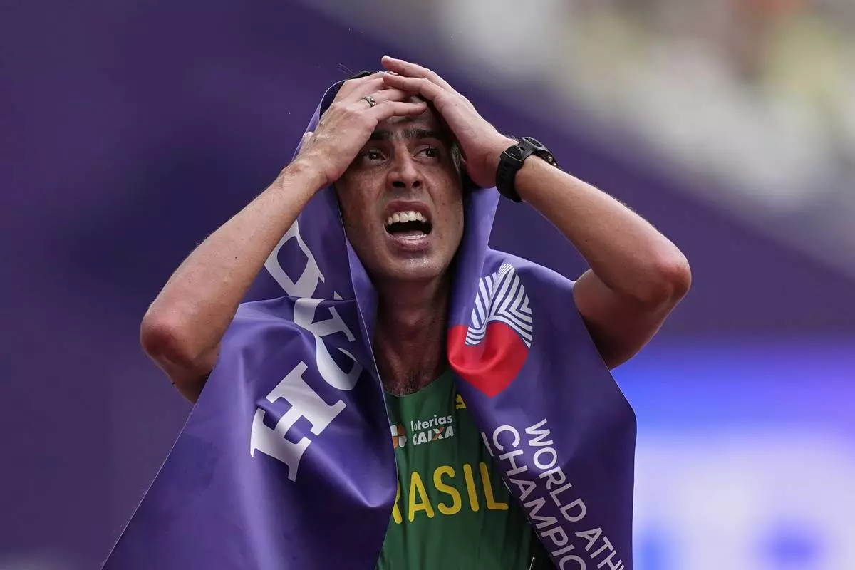 Brazil's Caio Bonfim celebrates winning the gold medal in the men's 20 kilometers race walk at the World Athletics Championships in Tokyo, Saturday, Sept. 20, 2025. (AP Photo/Petr David Josek)